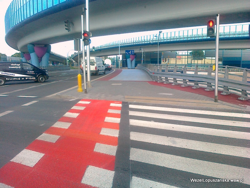 2012.06.25 – Węzeł Łopuszańska Warszawa – nowe czerwone malowanie pasów dla rowerów